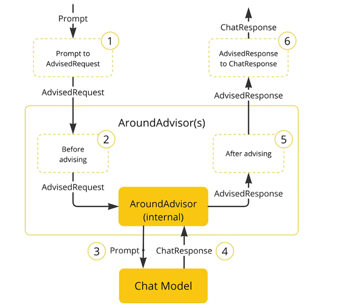 SpringAI在提示词发送到AI大模型之前(②Before advising)和大模型结果产生后但是发送到用户之前(⑤After advising)进行了环绕增强,我们可以在②位置处记录提示词(作为记忆功能),在⑤处记录输出的内容(记录返回日志)。