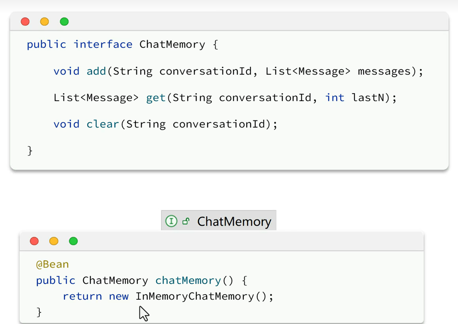SpringAI也提供了一个默认的实现InMemoryChatMemory(最新1.0.3版本已经换成MessageWindowChatMemory了),但这个是存储在内存中的,服务器重启记忆就没了。