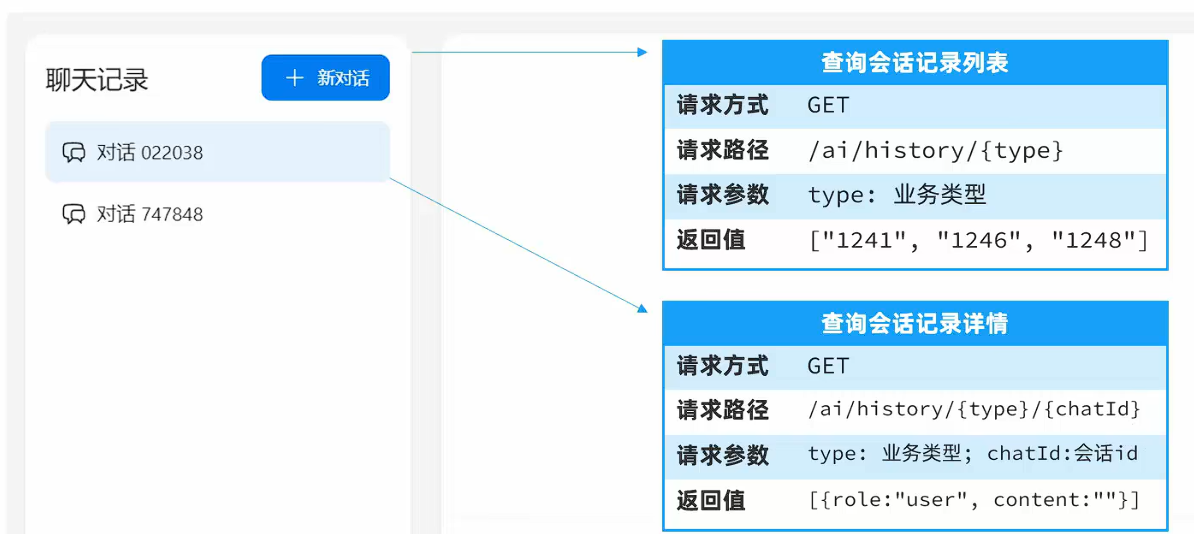 第一个请求是要查询到对应AI会话业务下的所有会话ID,即上图中左侧列表中的两个就是该请求的返回值。 第二个请求是要根据会话类型和会话id返回用户和AI的对话记录。