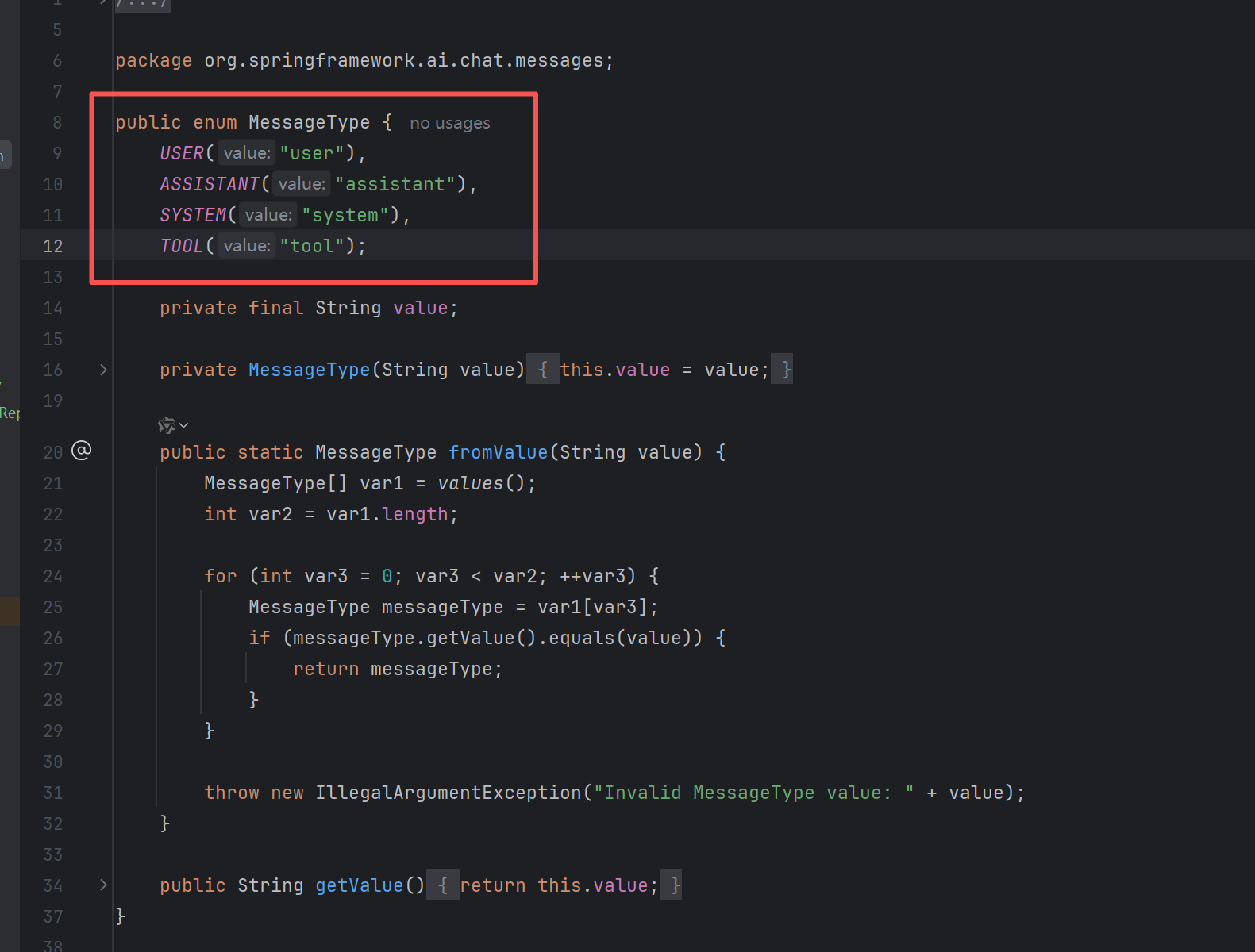 进入到 getMessageType() 方法里,其返回的是对话的角色(类型),我们只需要其中的 user(用户提问)和 assistant(ai回答)。