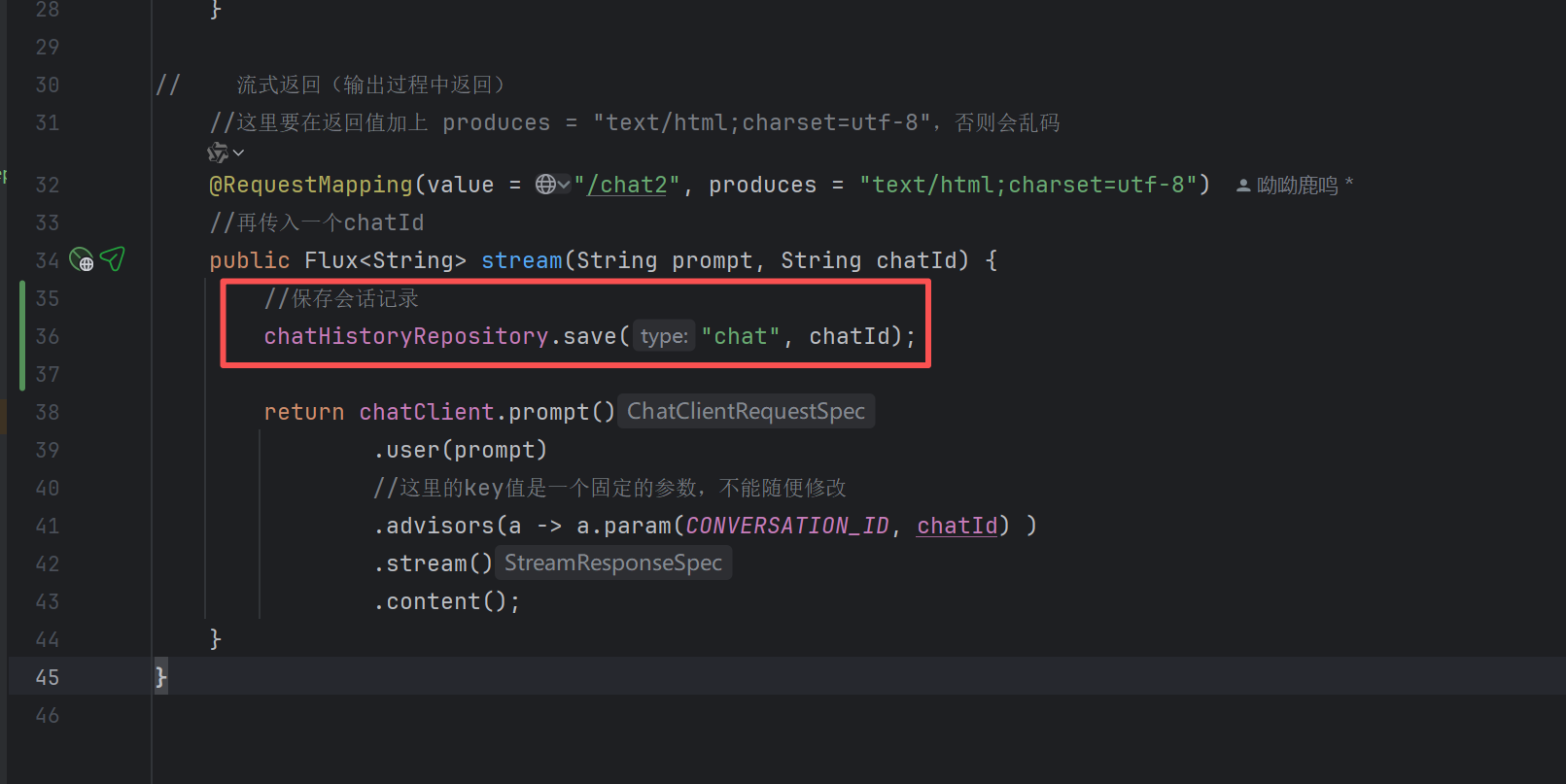 // 流式返回(输出过程中返回)//这里要在返回值加上 produces = "text/html;charset=utf-8",否则会乱码@RequestMapping(value = "/chat2", produces = "text/html;charset=utf-8")//再传入一个chatIdpublic Flux<String> stream(String prompt, String chatId) {return chatClient.prompt().user(prompt)//这里的key值是一个固定的参数,不能随便修改.advisors(a -> a.param(CONVERSATION_ID, chatId) ).stream().content();}