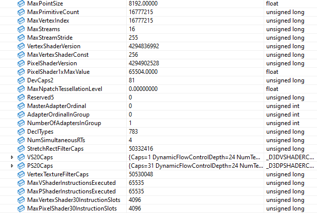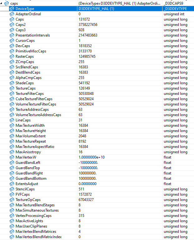 这样就获取到了D3DCAPS9结构体,里面有很多需要用到的信息