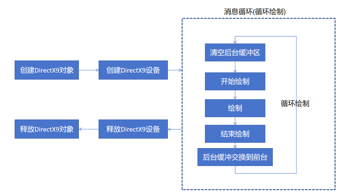 首先就是创建Direct3D 对象,然后,创建Direct3D设备,进入到循环渲染,退出的时候,先释放Direct3D设备,然后,释放Direct3D对象,就完成了渲染的主流程。