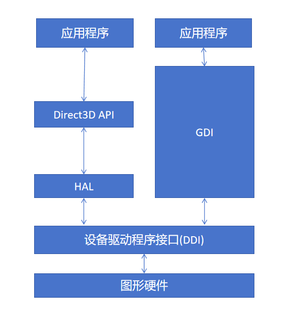 从图上从上到下,就是开发的应用调用图形渲染的功能流程,GDI就直接一些,Direct3D的话还需要一个HAL(硬件抽象层)来支持各种各样的显卡设备。