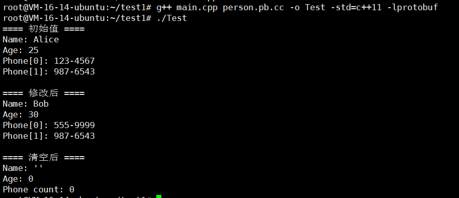 #include <iostream>using namespace tutorial;int main() {GOOGLE_PROTOBUF_VERIFY_VERSION;MyMessage msg;msg.set_name("Alice");std::cout << "=== 设置 option1 ===" << std::endl;msg.set_option1(100);// 1️⃣ 检测某个字段是否被设置std::cout << "has_option1: " << msg.has_option1() << std::endl;std::cout << "has_option2: " << msg.has_option2() << std::endl;// 2️⃣ 判断当前 oneof 设置的是哪个字段switch (msg.choice_case()) {case MyMessage::kOption1: std::cout << "Current: option1" << std::endl; break;case MyMessage::kOption2: std::cout << "Current: option2" << std::endl; break;case MyMessage::kOption3: std::cout << "Current: option3" << std::endl; break;case MyMessage::CHOICE_NOT_SET: std::cout << "Current: none" << std::endl; break;}std::cout << "\n=== 设置 option3 ===" << std::endl;msg.mutable_option3()->set_info("Hello protobuf");// 1️⃣ 再次检测字段std::cout << "has_option1: " << msg.has_option1() << std::endl;std::cout << "has_option3: " << msg.has_option3() << std::endl;// 2️⃣ 检测当前 oneof 设置switch (msg.choice_case()) {case MyMessage::kOption1: std::cout << "Current: option1" << std::endl; break;case MyMessage::kOption2: std::cout << "Current: option2" << std::endl; break;case MyMessage::kOption3: std::cout << "Current: option3" << std::endl; break;case MyMessage::CHOICE_NOT_SET: std::cout << "Current: none" << std::endl; break;}// 3️⃣ 获取值if (msg.has_option3()) {std::cout << "option3 info: " << msg.option3().info() << std::endl;}std::cout << "\n=== 清空 oneof ===" << std::endl;msg.clear_choice();std::cout << "choice_case after clear: " << msg.choice_case() << std::endl;google::protobuf::ShutdownProtobufLibrary();return 0;