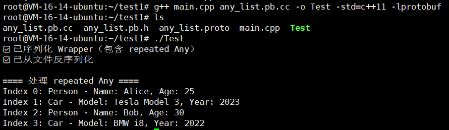 using google::protobuf::Any;int main() {GOOGLE_PROTOBUF_VERIFY_VERSION;// ==========================// 创建 Person 对象// ==========================tutorial::Person person1;person1.set_name("Alice");person1.set_age(25);tutorial::Person person2;person2.set_name("Bob");person2.set_age(30);// 创建 Car 对象tutorial::Car car1;car1.set_model("Tesla Model 3");car1.set_year(2023);tutorial::Car car2;car2.set_model("BMW i8");car2.set_year(2022);// ==========================// 包装到 Wrapper 的 repeated Any// ==========================tutorial::Wrapper wrapper;wrapper.set_description("Wrapper with multiple Any messages");// 打包消息wrapper.add_data_list()->PackFrom(person1);wrapper.add_data_list()->PackFrom(car1);wrapper.add_data_list()->PackFrom(person2);wrapper.add_data_list()->PackFrom(car2);// ==========================// 序列化到文件// =========================={fstream out("wrapper_list.bin", ios::out | ios::trunc | ios::binary);wrapper.SerializeToOstream(&out);}cout << "✅ 已序列化 Wrapper(包含 repeated Any)" << endl;// ==========================// 反序列化// ==========================tutorial::Wrapper wrapper2;{fstream in("wrapper_list.bin", ios::in | ios::binary);wrapper2.ParseFromIstream(&in);}cout << "✅ 已从文件反序列化" << endl;// ==========================// 循环处理 repeated Any// ==========================cout << "\n==== 处理 repeated Any ====" << endl;for (int i = 0; i < wrapper2.data_list_size(); ++i) {const Any& any_msg = wrapper2.data_list(i);// 判断类型并解包if (any_msg.Is<tutorial::Person>()) {tutorial::Person p;any_msg.UnpackTo(&p);cout << "Index " << i << ": Person - Name: " << p.name() << ", Age: " << p.age() << endl;} else if (any_msg.Is<tutorial::Car>()) {tutorial::Car c;any_msg.UnpackTo(&c);cout << "Index " << i << ": Car - Model: " << c.model() << ", Year: " << c.year() << endl;} else {cout << "Index " << i << ": ❌ Unknown message type" << endl;}}google::protobuf::ShutdownProtobufLibrary();return 0;