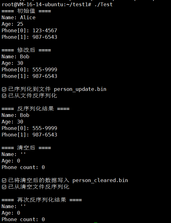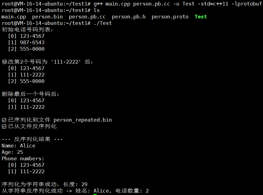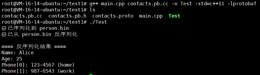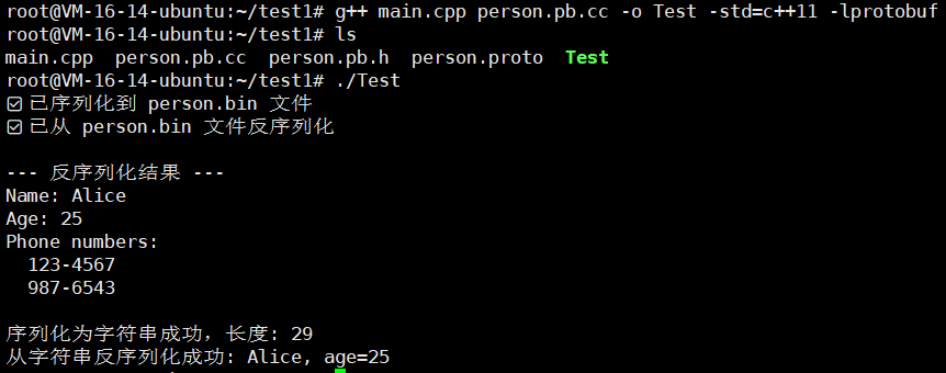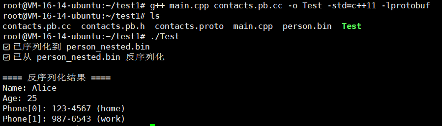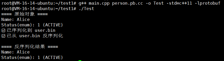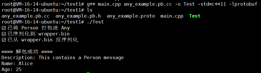 using google::protobuf::Any;int main() {GOOGLE_PROTOBUF_VERIFY_VERSION;// ===== 创建一个 Person 对象 =====tutorial::Person person;person.set_name("Alice");person.set_age(25);// ===== 创建一个 Wrapper,并用 Any 包装 Person =====tutorial::Wrapper wrapper;wrapper.set_description("This contains a Person message");Any* any_data = wrapper.mutable_data();any_data->->PackFrom(person); // 序列化 Person 到 Any 中cout << "✅ 已将 Person 打包进 Any" << endl;// ===== 序列化 Wrapper 到文件 ====={fstream output("wrapper.bin", ios::out | ios::trunc | ios::binary);if (!wrapper.SerializeToOstream(&output)) {cerr << "❌ Failed to write wrapper.bin" << endl;return -1;}cout << "✅ 已序列化到 wrapper.bin" << endl;}// ===== 从文件反序列化 =====tutorial::Wrapper wrapper2;{fstream input("wrapper.bin", ios::in | ios::binary);if (!wrapper2.ParseFromIstream(&input)) {cerr << "❌ Failed to read wrapper.bin" << endl;return -1;}cout << "✅ 已从 wrapper.bin 反序列化" << endl;}// ===== 解包 Any(取回原始 Person)=====tutorial::Person unpacked_person;if (wrapper2.data().UnpackTo(&unpacked_person)) {cout << "\n==== 解包成功 ====" << endl;cout << "Description: " << wrapper2.description() << endl;cout << "Name: " << unpacked_person.name() << endl;cout << "Age: " << unpacked_person.age() << endl;} else {cout << "❌ Any 不是 Person 类型" << endl;}google::protobuf::ShutdownProtobufLibrary();return 0;