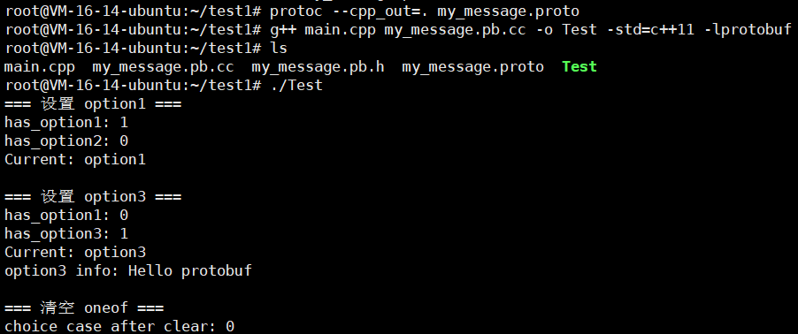 #include <iostream>int main() {tutorial::MyMessage msg;msg.set_name("Alice");msg.set_option1(100);std::cout << "Option1: " << msg.option1() << std::endl;msg.set_option2(200); // 会自动清空 option1if (msg.has_option1()) {std::cout << "Option1 still set" << std::endl;} else {std::cout << "Option1 cleared" << std::endl;}std::cout << "Option2: " << msg.option2() << std::endl;// 你还可以用 oneof_case() 判断当前设置的是哪一个switch (msg.choice_case()) {case tutorial::MyMessage::kOption1:std::cout << "Currently set: Option1" << std::endl;break;case tutorial::MyMessage::kOption2:std::cout << "Currently set: Option2" << std::endl;break;case tutorial::MyMessage::kOption3:std::cout << "Currently set: Option3" << std::endl;break;case tutorial::MyMessage::CHOICE_NOT_SET:std::cout << "No option set" << std::endl;break;}return 0;