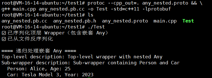 好,我们来写一个 递归 Any 的例子,也就是 Any 内嵌 Any,模拟多层消息结构,非常适合复杂业务场景。