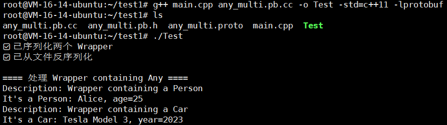 using google::protobuf::Any;int main() {GOOGLE_PROTOBUF_VERIFY_VERSION;// ==========================// 1️⃣ 创建 Person 对象// ==========================tutorial::Person person;person.set_name("Alice");person.set_age(25);// 创建 Car 对象tutorial::Car car;car.set_model("Tesla Model 3");car.set_year(2023);// ==========================// 2️⃣ 包装到 Wrapper 中// ==========================tutorial::Wrapper wrapper_person;wrapper_person.set_description("Wrapper containing a Person");wrapper_person.mutable_data()->PackFrom(person);tutorial::Wrapper wrapper_car;wrapper_car.set_description("Wrapper containing a Car");wrapper_car.mutable_data()->PackFrom(car);// ==========================// 3️⃣ 序列化到文件// =========================={fstream out("wrapper_person.bin", ios::out | ios::trunc | ios::binary);wrapper_person.SerializeToOstream(&out);fstream out2("wrapper_car.bin", ios::out | ios::trunc | ios::binary);wrapper_car.SerializeToOstream(&out2);}cout << "✅ 已序列化两个 Wrapper" << endl;// ==========================// 4️⃣ 反序列化// ==========================tutorial::Wrapper w_person2;tutorial::Wrapper w_car2;{fstream in("wrapper_person.bin", ios::in | ios::binary);w_person2.ParseFromIstream(&in);fstream in2("wrapper_car.bin", ios::in | ios::binary);w_car2.ParseFromIstream(&in2);}cout << "✅ 已从文件反序列化" << endl;// ==========================// 5️⃣ 判断类型并解包// ==========================cout << "\n==== 处理 Wrapper containing Any ====" << endl;// Person// 判断 w_person2 中的 Any 是否为 Person 类型if (w_person2.data().Is<tutorial::Person>()) {tutorial::Person p;w_person2.data().UnpackTo(&p);cout << "Description: " << w_person2.description() << endl;cout << "It's a Person: " << p.name() << ", age=" << p.age() << endl;}// Car// 判断 w_car2 中的 Any 是否为 Car 类型if (w_car2.data().Is<tutorial::Car>()) {tutorial::Car c;w_car2.data().UnpackTo(&c);cout << "Description: " << w_car2.description() << endl;cout << "It's a Car: " << c.model() << ", year=" << c.year() << endl;}google::protobuf::ShutdownProtobufLibrary();return 0;