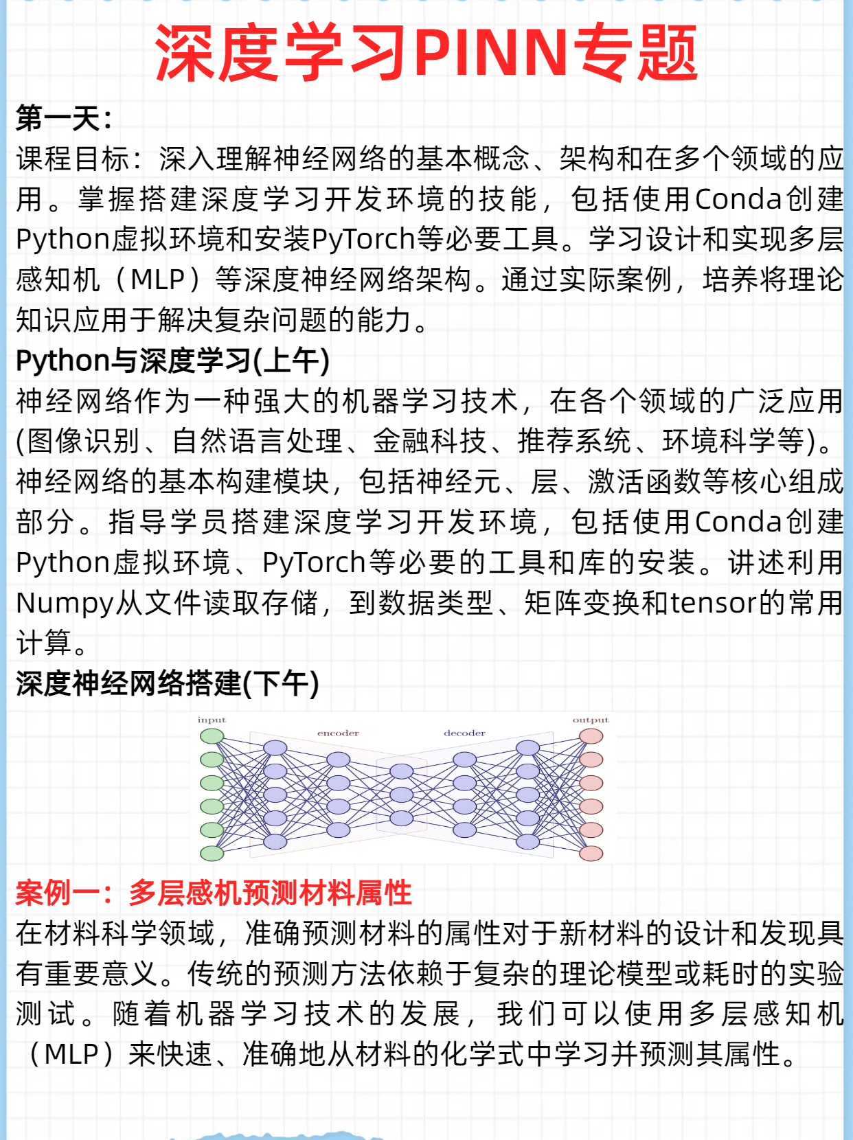 在逐步引导学员掌握神经网络和物理信息神经网络(PINN)的理论知识和实践技能。从基础的神经网络架构开始,课程内容逐步深入到PINN在不同领域的应用,并教授学员如何使用DeepXDE工具包来简化PINN模型的开发和训练。学员将学习搭建深度学习环境,设计多层感知机等深度神经网络,并应用于解决实际问题。课程重点探讨PINN如何结合物理定律和数据驱动学习,解决正问题和逆问题,以及在流体力学、固体力学等领域的应用。此外,学员还将学习PINN在处理耦合系统和复杂系统中的应用,如热流耦合和电池系统预测。最后,课程将提升学员对PINN优化技巧的理解,并介绍DeepXDE工具包的使用,以解决物理和化学领域的实际问题。