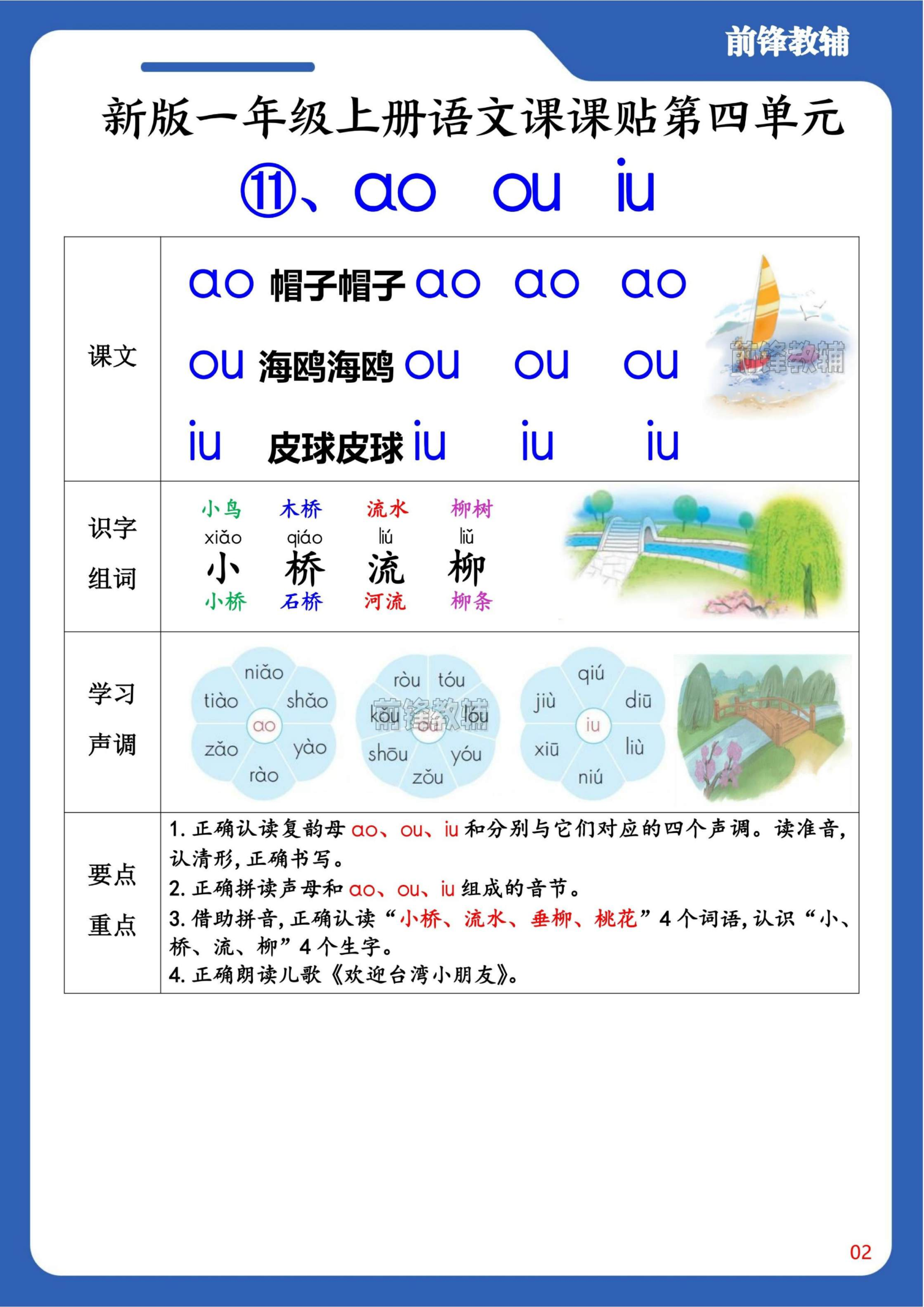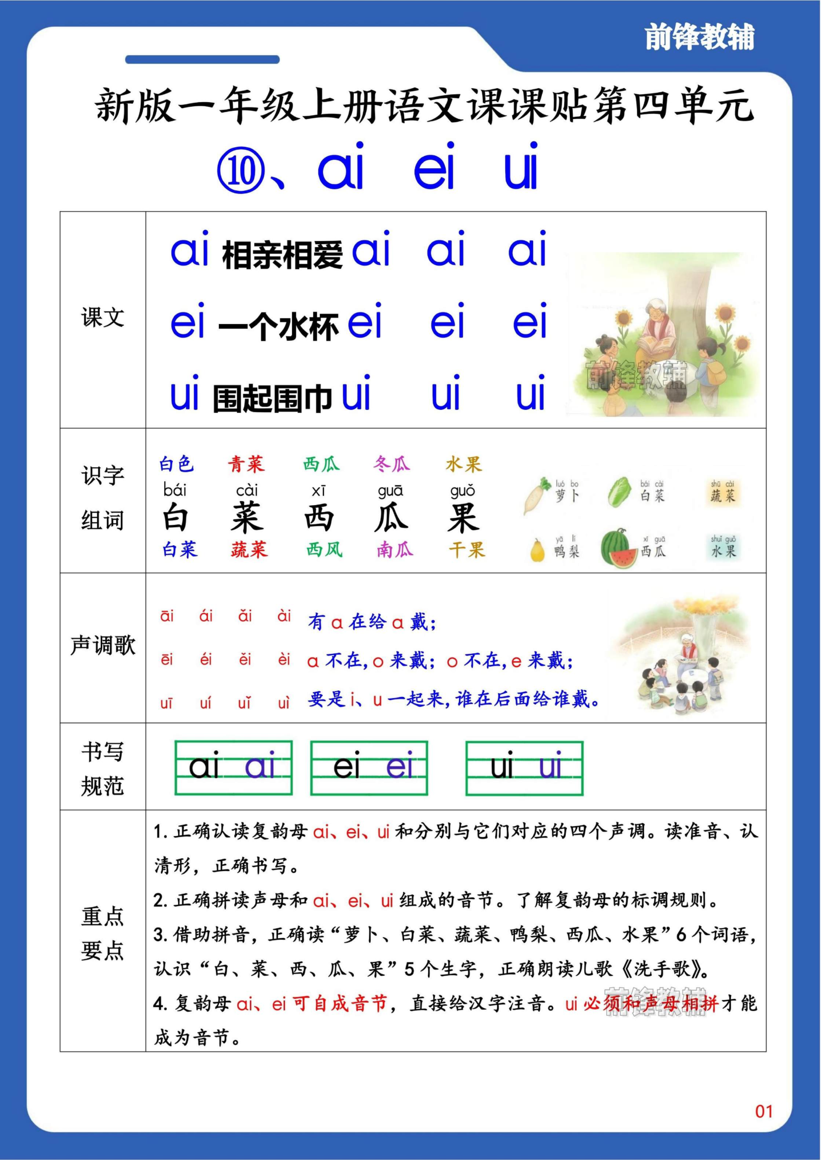 这份资料是宝库盒教辅整理的专业资料,专门针对一年级上册语文第四单元,核心围绕复韵母学习,像ai、ei、ui、ao、ou、iu这些易混复韵母都有详细讲解,还有对应的声调练习和拼读训练。里面还包含识字组词内容,比如“西瓜”“白菜”“小桥”等常用词,能帮孩子同步巩固拼音和生字。另外,资料里还有《洗手歌》《欢迎台湾小朋友》等儿歌,能让孩子在朗读中加深拼音记忆,特别适合一年级孩子打牢拼音基础。