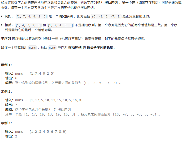 class Solution {public int wiggleMaxLength(int[] nums) {if(nums.length<=1) return nums.length;int count = 1; //最少有一个摆动序列int prediff = 0;for(int i=1;i<nums.length;i++){int diff = nums[i]-nums[i-1];if(prediff>=0 && diff<0 || prediff<=0 && diff>0){count++;prediff = diff;}}return count;}