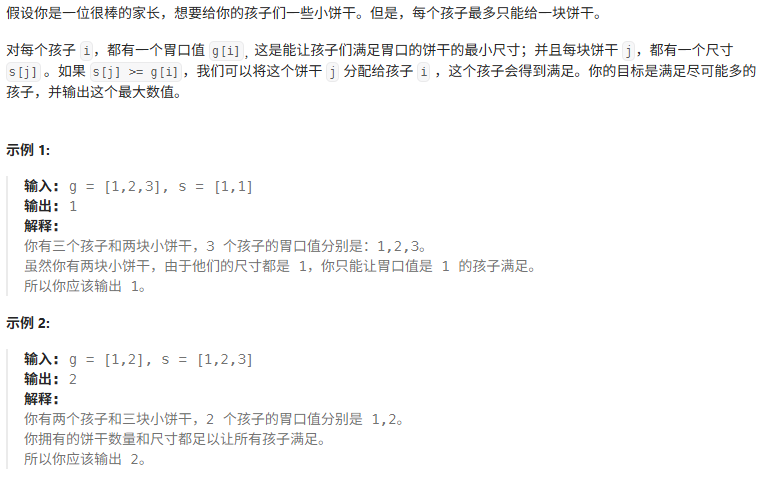 class Solution {public int findContentChildren(int[] g, int[] s) {Arrays.sort(g);Arrays.sort(s);int res = 0;int gIndex=0;int sIndex=0;while(gIndex<g.length && sIndex<s.length){if(s[sIndex]>=g[gIndex]){res++;sIndex++;gIndex++;}else{sIndex++;}}return res;}