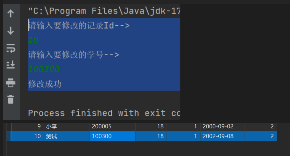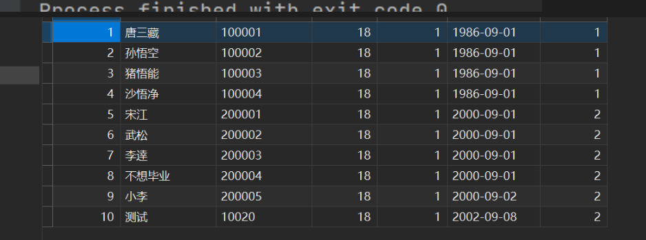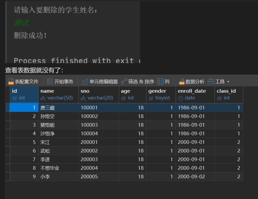 执⾏select查询时返回的是⼀个结果集,⽤ResultSet接收 执⾏nsert, update, delete操作时,返回的是受影响的⾏数,⽤int类型接收String sql ="select id,name,sno,age,gender,enroll_date,class_id from student"; //5执行sql语句(增删改都用executeUpdate方法) //查询是executeQuery方法 resultSet= statement.executeQuery(sql);//获取结果