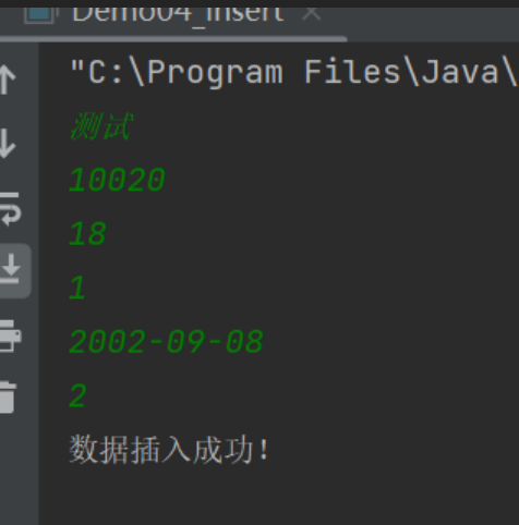 package com.bitjiuyeke; import com.mysql.cj.jdbc.MysqlDataSource; import javax.sql.DataSource; import java.sql.*; import java.util.Scanner; public class Demo04_Insert { public static void main(String[] args) { //定义mysql数据源 MysqlDataSource mysqlDataSource = new MysqlDataSource(); //设置数据库的连接串 mysqlDataSource.setURL("jdbc:mysql://localhost:3306/java116"); //设置用户名和密码 mysqlDataSource.setUser("root"); mysqlDataSource.setPassword("123456"); //定义jdbc数据源对象 DataSource dataSource = mysqlDataSource; //声明数据库连接对象 Connection connection = null; //声明sql语句预处理对象 PreparedStatement statement = null; //声明查询结果集对象 ResultSet resultSet = null; try {//1获取数据库连接 connection = dataSource.getConnection(); //2定义sql语句 String sql = "insert into student (name,sno,age,gender,enroll_date,class_id) values(?,?,?,?,?,?) "; // 占位符替换 // 3获取sql预处理对象 statement = connection.prepareStatement(sql); // 接收用户输入的姓名 Scanner scanner = new Scanner(System.in); String inputname = scanner.next(); String inputsno=scanner.next(); int inputage=scanner.nextInt(); String inputgender=scanner.next(); String inputenroll_date=scanner.next(); int inputclass_id=scanner.nextInt(); // 4设置参数 statement.setString(1, inputname); statement.setString(2, inputsno); statement.setInt(3, inputage); statement.setString(4, inputgender); statement.setString(5, inputenroll_date); statement.setInt(6, inputclass_id); // 5执行sql语句 int row = statement.executeUpdate(); // 获取查询结果集 // 6遍历一条结果集,使用if语句 if (row==1 ) { // resultSet.next()返回true则有下一行数据,false则没有 // 获取数据列 System.out.println("数据插入成功!"); }else { System.out.println("数据插入失败!"); } } catch (SQLException e) { throw new RuntimeException(e); } finally { // 7关闭资源 if (resultSet != null) { try { resultSet.close(); } catch (SQLException e) { throw new RuntimeException(e); } } if (statement != null) { try { statement.close(); } catch (SQLException e) { throw new RuntimeException(e); } } if (connection != null) { try { connection.close(); } catch (SQLException e) { throw new RuntimeException(e); } } } } }