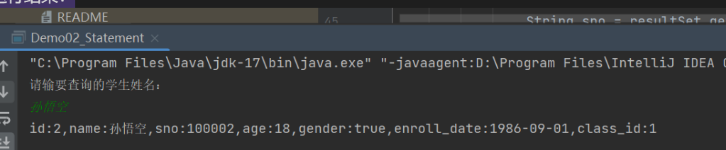 我们如果想打印一列:就如下代码 打印一列,遍历结果集使用if package com.bitjiuyeke; import java.sql. * ; import java.util.Scanner; public class Demo02_Statement { public static void main(String[] args) { Connection connection = null; Statement statement =null; ResultSet resultSet = null; //1:加载数据库厂商提供的驱动 try { Class.forName("com.mysql.cj.jdbc.Driver"); //2:创建数据库连接 connection = DriverManager.getConnection( "jdbc:mysql://localhost:3306/java116", "root", "123456"); //3创建statement对象,执行sql语句 statement = connection.createStatement(); Scanner scanner= new Scanner(System.in); String inputname = scanner.next(); //4定义sql语句 String sql ="select id,name,sno,age,gender,enroll_date,class_id from student where name = '"+inputname+"'"; //5执行sql语句(增删改都用executeUpdate方法) //查询是executeQuery方法 resultSet= statement.executeQuery(sql);//获取结果 //6遍历结果集,获取数据行 //遍历多条数据,使用while循环 // while (resultSet.next()){//resultSet.next()返回true则有下一行数据,false则没有 // //7获取数据列 // int id = resultSet.getInt(1); // String name = resultSet.getString(2); // String sno = resultSet.getString(3); // int age = resultSet.getInt(4); // Boolean gender = resultSet.getBoolean(5); // Date enroll_date = resultSet.getDate(6); // int class_id = resultSet.getInt(7); // //8输出数据 // System.out.println("id:"+id+",name:"+name+",sno:"+sno+",age:"+age+",gender:"+gender+",enroll_date:"+enroll_date+",class_id:"+class_id); // } //遍历一条结果集,使用if语句 if (resultSet.next()){//resultSet.next()返回true则有下一行数据,false则没有 //7获取数据列 int id = resultSet.getInt(1); String name = resultSet.getString(2); String sno = resultSet.getString(3); int age = resultSet.getInt(4); Boolean gender = resultSet.getBoolean(5); Date enroll_date = resultSet.getDate(6); int class_id = resultSet.getInt(7); //8输出数据 System.out.println("id:"+id+",name:"+name+",sno:"+sno+",age:"+age+",gender:"+gender+",enroll_date:"+enroll_date+",class_id:"+class_id); } }catch (ClassNotFoundException esthrow new RuntimeException(e); } } } } }
