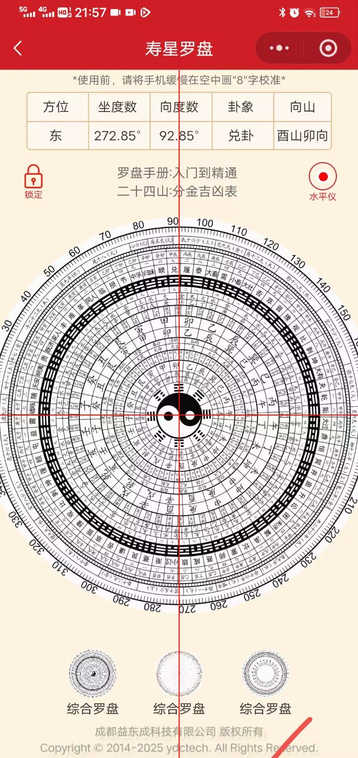微信小程序电子罗盘,使用前,将手机缓慢在空中画"8"字校准。一般民间使用风水罗盘精度在0.1度左右,寿星罗盘精度误差在0.01度,是精度极高的风水罗盘工具。