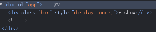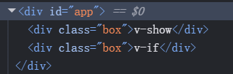 <div id="app"><div v-show="flag" class="box">v-show</div><div v-if="flag" class="box">v-if</div></div><script src="vue.js"></script><script>const app = new Vue({el: '#app',data: {flag: false}})</script>
