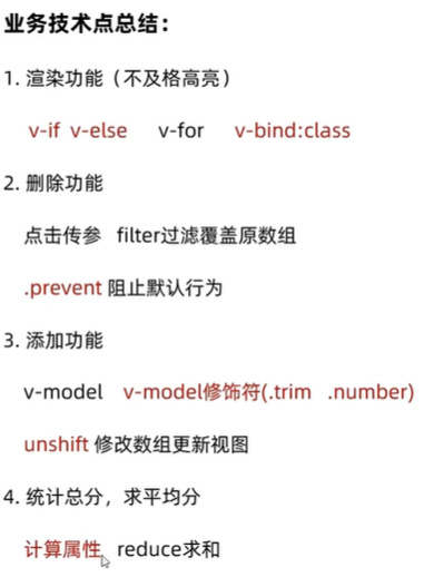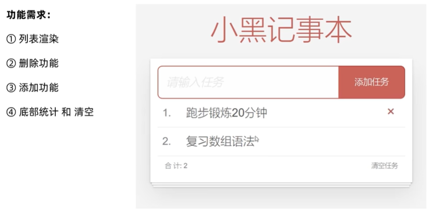 <!-- 主体区域 --><section id="app"><!-- 输入框 --><header class="header"><h1>小黑记事本</h1><input v-model="todoName" placeholder="请输入任务" class="new-todo" /><button @click="add()" class="add">添加任务</button></header><!-- 列表区域 --><section class="main"><ul class="todo-list"><li class="todo" v-for="(item,index) in list" :key="item.id"><div class="view"><span class="index">{{index+1}}.</span> <label>{{item.name}}</label><button class="destroy" @click="del(item.id)"></button></div></li></ul></section><!-- 统计和清空 --><footer class="footer" v-show="list.length>0"><!-- 统计 --><span class="todo-count">合 计:<strong> {{list.length}} </strong></span><!-- 清空 --><button @click="clear()" class="clear-completed">清空任务</button></footer></section><!-- 底部 --><script src="https://cdn.jsdelivr.net/npm/vue/dist/vue.js"></script><script>// 添加功能// 通过 v-model 绑定输入框// 点击按钮 ,新增,往数组最前面加,unshiftconst app = new Vue({el: '#app',data: {todoName: '',list: [{ id: 1, name: '敲代码' },{ id: 2, name: '听音乐' },{ id: 3, name: 'Timi' }]},methods: {del(id) {this.list = this.list.filter(item => item.id != id)},add() {if (this.todoName) {this.list.unshift({id: +new Date,name: this.todoName})} else {alert('请输入任务名称')}this.todoName = ''},clear() {this.list = []}}})</script>