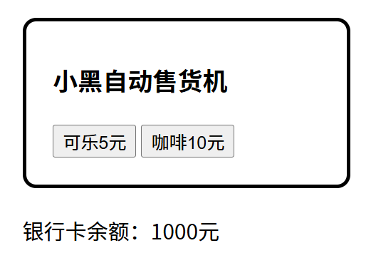 <div id="app"><div class="box"><h3>小黑自动售货机</h3><button @click="buy(5)">可乐5元</button><button @click="buy(10)">咖啡10元</button></div><p>银行卡余额:{{resMoney}}元</p></div><script src="./vue.js"></script><script>const app = new Vue({el: '#app',data: {resMoney: 1000},methods: {buy(price) {this.resMoney -= price}}})</script>