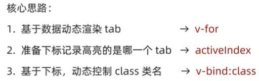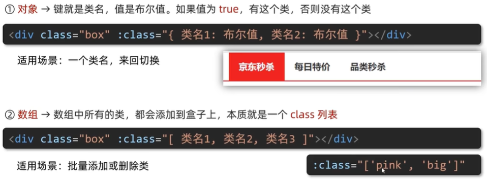 <div id="app"><ul><li v-for="(item,index) in list" :key="item.id" @click="activeIndex=index"><a :class="{active: index===activeIndex}" href="#">{{item.name}}</a></li></ul></div><script src="./vue.js"></script><script>const app = new Vue({el: '#app',data: {activeIndex: 0, //记录哪个 li 高亮list: [{ id: 1, name: '京东秒杀' },{ id: 2, name: '每日特价' },{ id: 3, name: '品类秒杀' }]}})</script>
