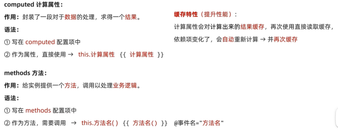 <div id="app"><h3>小黑的礼物清单🛒<span>{{totalCount}}</span></h3><h3>小黑的礼物清单🛒<span>{{totalCountFn()}}</span></h3><table><tr><th>名字</th><th>数量</th></tr><tr v-for="(item, index) in list" :key="item.id"><td>{{ item.name }}</td><td>{{ item.num }}个</td></tr></table><p>礼物总数:{{ totalCount }} 个</p></div><script src="./vue.js"></script><script>const app = new Vue({el: '#app',data: {// 现有的数据list: [{ id: 1, name: '篮球', num: 3 },{ id: 2, name: '玩具', num: 2 },{ id: 3, name: '铅笔', num: 5 },]},methods: {totalCountFn() {console.log(methods) // 执行一次,打印一次let total = this.list.reduce((sum, item) => sum + item.num, 0)return total}},computed: {// 计算属性:有缓存的,一旦计算出结果,就会立刻缓存// 下一次读取 -> 直接读缓存就行totalCount() {console.log(computed) //不修改数据,只打印一次let total = this.list.reduce((sum, item) => sum + item.num, 0)return total}}})</script>