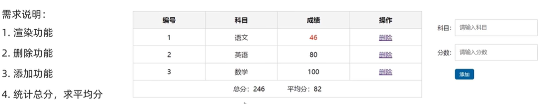 <div id="app" class="score-case"><div class="table"><table><thead><tr><th>编号</th><th>科目</th><th>成绩</th><th>操作</th></tr></thead><tbody v-if="list.length > 0"><tr v-for="(item,index) in list" :key="item.id"><td>{{index+1}}</td><td>{{item.subject}}</td><td :class="{ red:item.score < 60 }">{{item.score}}</td><td><a @click.prevent="del(item.id)" href="#">删除</a></td></tr></tr></tbody><tbody v-else><tr><td colspan="5"><span class="none">暂无数据</span></td></tr></tbody><tfoot><tr><td colspan="5"><span>总分:{{tetalScore}}</span><span style="margin-left: 50px">平均分:{{averageScore}}</span></td></tr></tfoot></table></div><div class="form"><div class="form-item"><div class="label">科目:</div><div class="input"><input type="text" placeholder="请输入科目" v-model.trim="subject" /></div></div><div class="form-item"><div class="label">分数:</div><div class="input"><input type="text" placeholder="请输入分数" v-model.number="score" /></div></div><div class="form-item"><div class="label"></div><div class="input"><button @click="add()" class="submit">添加</button></div></div></div></div><script src="./vue.js"></script><script>const app = new Vue({el: '#app',data: {list: [{ id: 1, subject: '语文', score: 20 },{ id: 7, subject: '数学', score: 99 },{ id: 12, subject: '英语', score: 70 },],subject: '',score: ''},methods: {del(id) {this.list = this.list.filter(item => item.id != id)},add() {if (!this.subject) {alert('请输入科目')return}if (typeof this.score !== 'number') {alert('请输入正确的分数')return}this.list.unshift({id: +new Date(),subject: this.subject,score: this.score})this.subject = ''this.score = ''}},computed: {tetalScore() {return this.list.reduce((sum, item) => sum + item.score, 0)},averageScore() {if (this.list.length === 0) return 0return (this.tetalScore / this.list.length).toFixed(2)}}})</script>