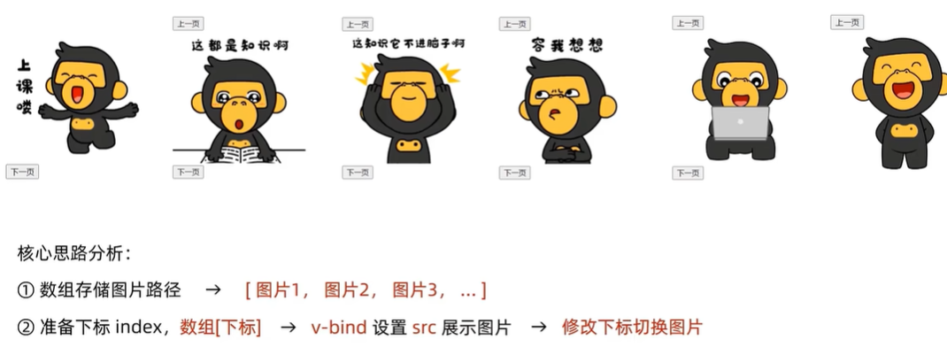<div id="app"><button v-show="index > 0" @click="index--">上一页</button><div><!-- 通过 :src="list[index]" 动态设置图片的url --><img :src="list[index]" alt=""></div><button v-show="index<list.length-1" @click="index++">下一页</button></div><script src="./vue.js"></script><script>const app = new Vue({el: '#app',// 用数组存放需要切换的图片data: {index: 0,list: ['./images/11-00.gif','./images/11-01.gif','./images/11-02.gif','./images/11-03.gif','./images/11-04.png','./images/11-05.png',]}})</script>