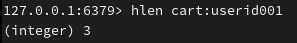 由上图可知购物车的商品总数是3条(1001 1002 1003),使用HLEN key 获得