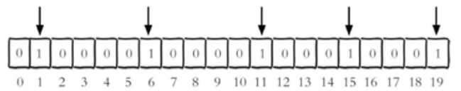 设置键的第offset个位的值(从0算起) , 假设现在有20个用户,userid=1,6,11,15,19的用户对网站进行了访问, 那么当前Bitmaps初始化结果如图: