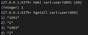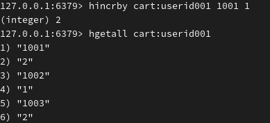 物车商品数量+1使用 hincrby key field increment(购物车1001的商品+1,由原来的1个变成2个)