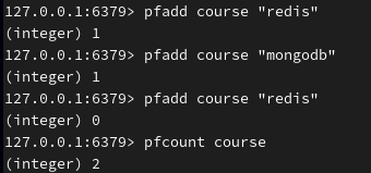 将字符串添加到 HLL 数据结构 course 集合中,计算基数,若基数变化(是新元素)则返回1否则返回0。并统计基数数量(去重):