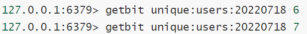 获取键的第offset位的值(从0开始算)。例如获取id=6的用户是否在2022-07-18这天访问过, 返回0说明没有访问过: