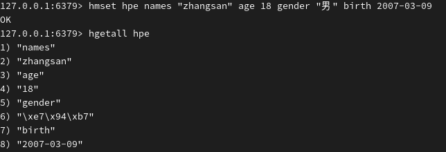 批量设置 hash 字段及对应的值,再查询所有字段和值: