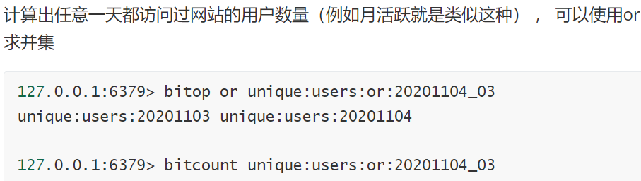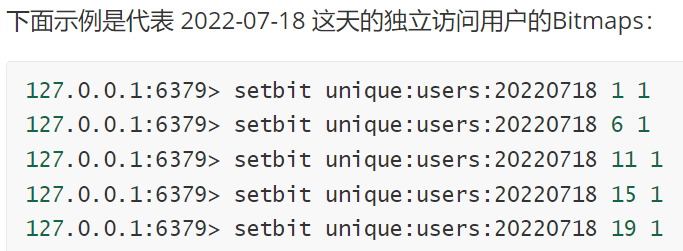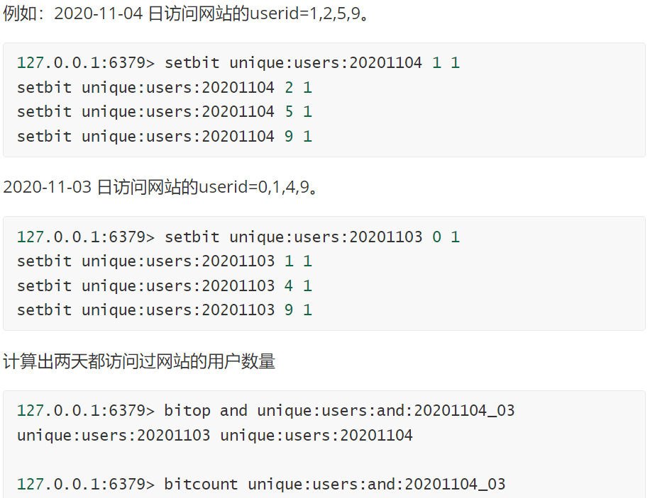 SETBIT key offset value | 用于对指定 key 所存储的字符串值,设置或清除指定偏移量上的位(bit) setbit lisi 1 0 用用户 ID 作为键名,偏移量代表日期,位值为 1 表示签到,0 表示未签到。 |