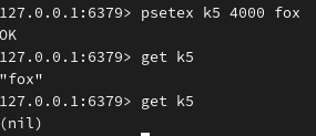 设置键 k5 的值为 fox ,过期时间单位为4000毫秒: