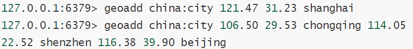 有效的经度从 -180 度到 180 度。有效的纬度从 -85.05112878 度到 85.05112878 度。当坐标位置超出指定范围时,该命令将会返回一个错误。已经添加的数据,是无法再次往里面添加的。