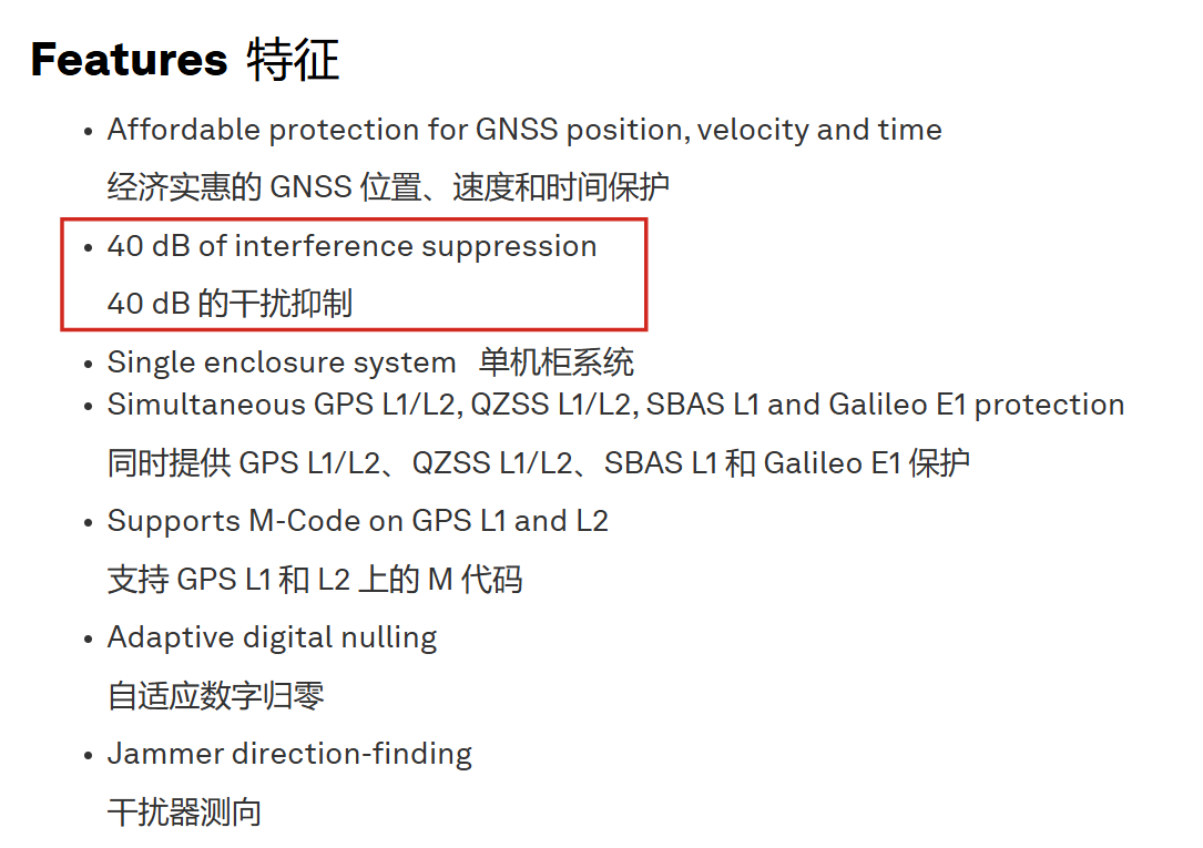 我们以 Novatel 公司的 GPS Anti-Jam Technology 产品,型号为 GAJT-710MS 的抗干扰天线的技术指标为例,官网上给出的干扰抑制能力指标是:40dB。