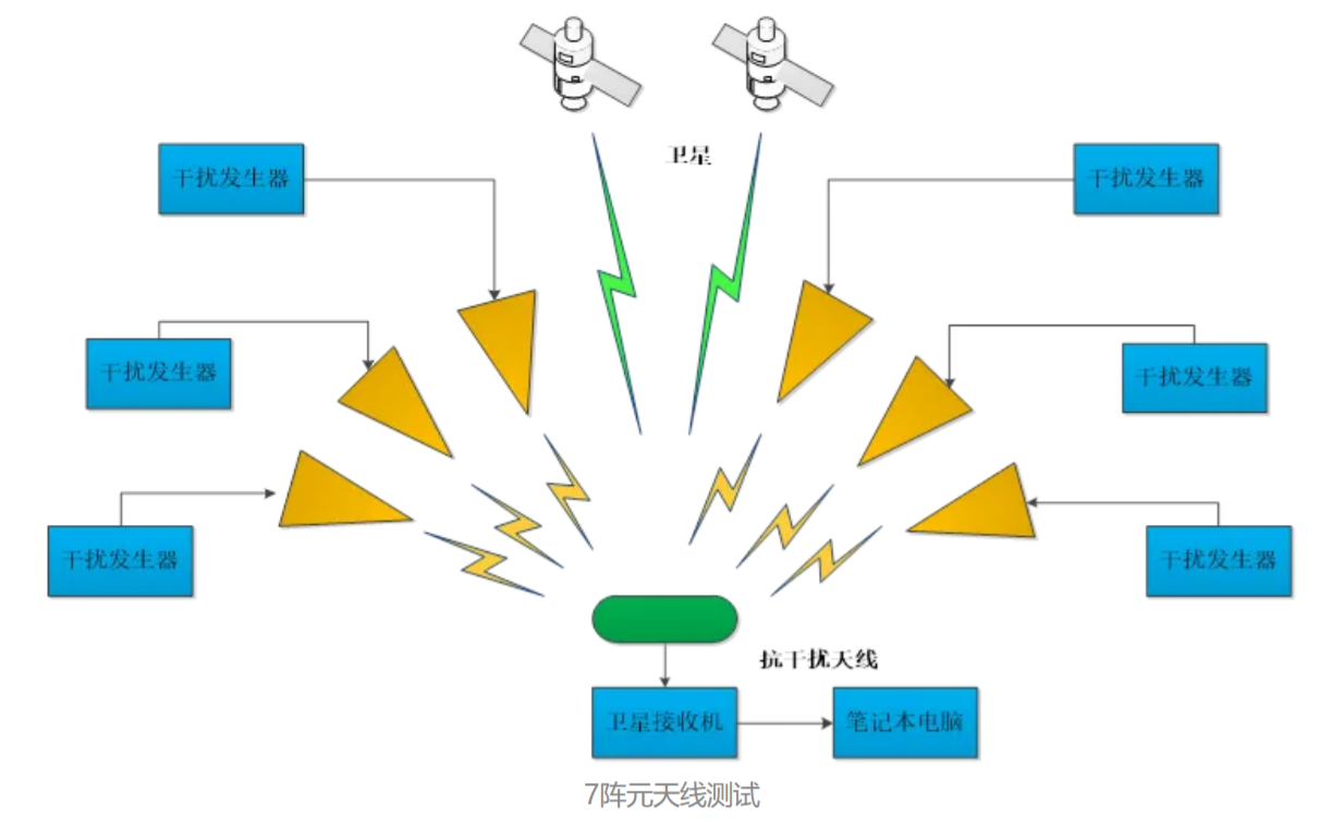 我们在抗干扰天线的性能怎么测试?中提到了抗干扰天线的测试方法。整个测试系统组成如下图。抗干扰天线和 GPS 接收机连接在一起测试,最终考核天线的抗干扰能力是采用的依据是:GPS 接收机在不同干扰功率条件下的定位成功率。