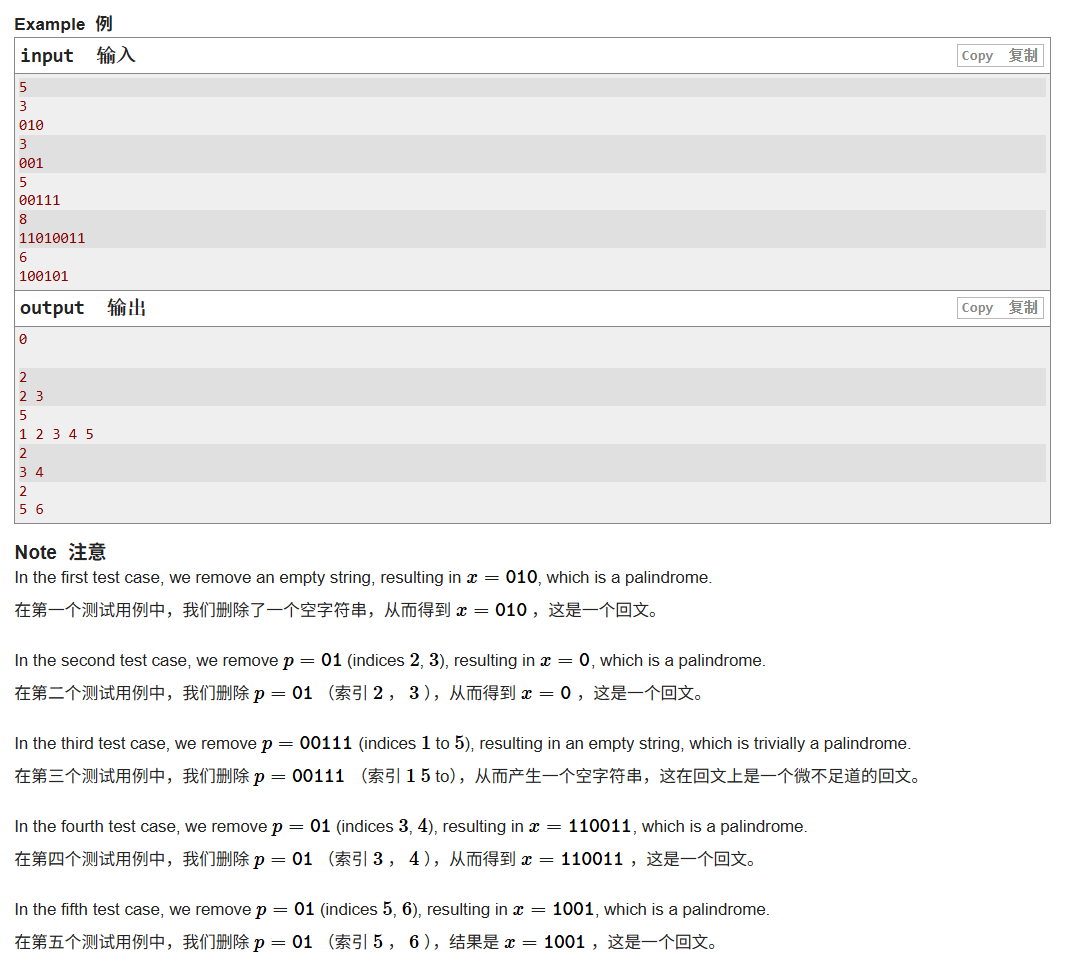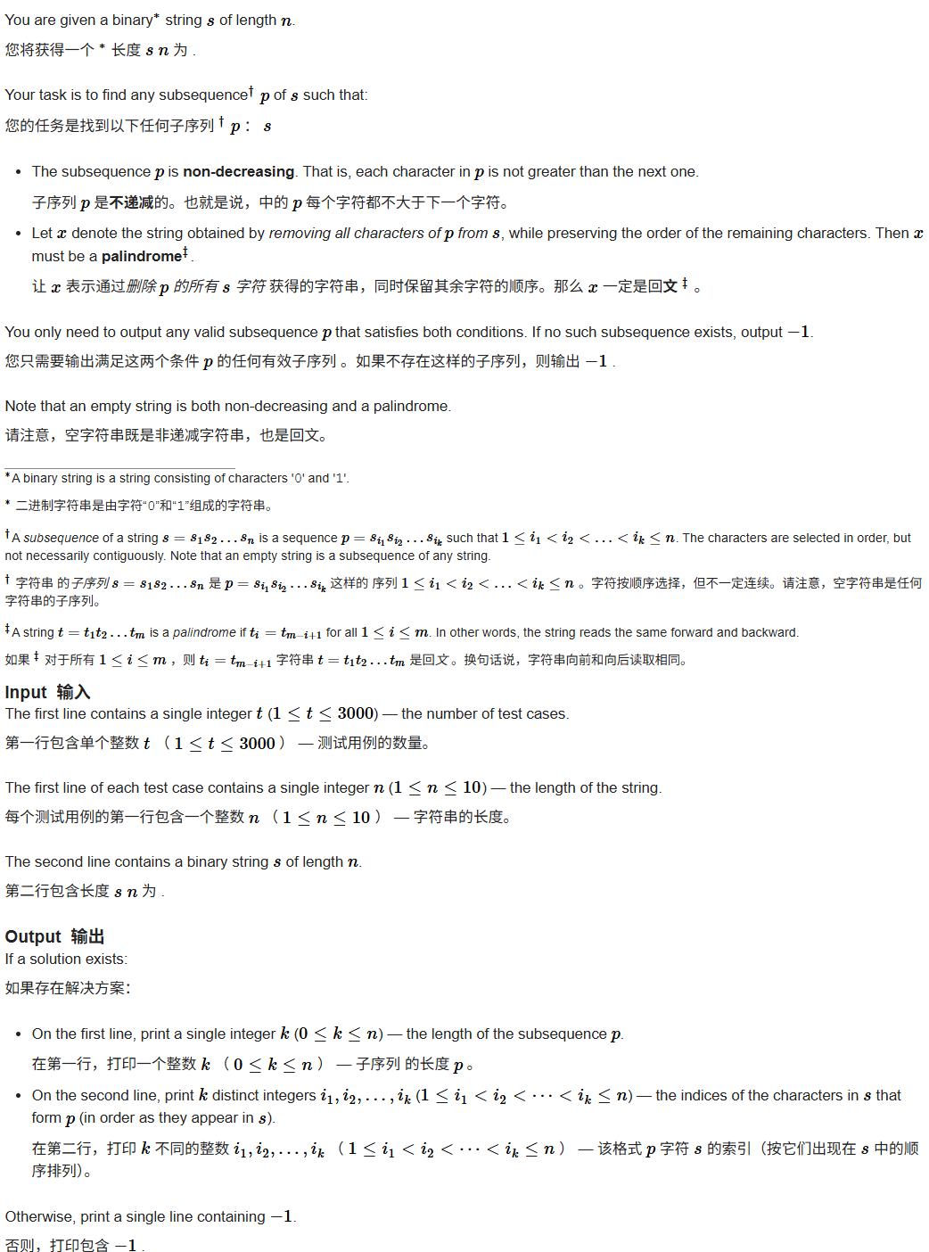 这题题目很长,但其实就是给你一个只有0和1作为元素的字符串,然后你可以删掉一个不递减的子串,然后剩余的字符串需要是回文串