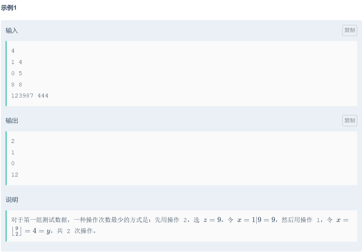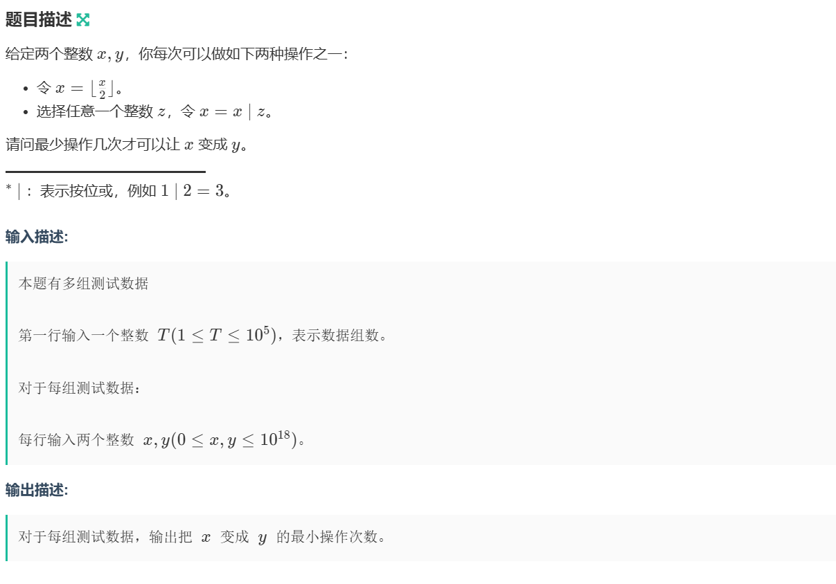 所以只需要一直对x进行1的操作,然后判断x是不是所有的1的位置,在y那也是1,如果这个条件满足了,就判断这俩个数是不是相等的,如果相等,就不用或了,直接输出次数就可以了,如果不相等,就次数再加一就可以了