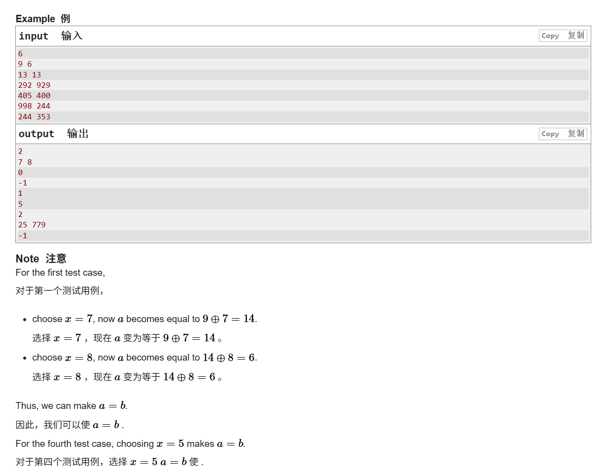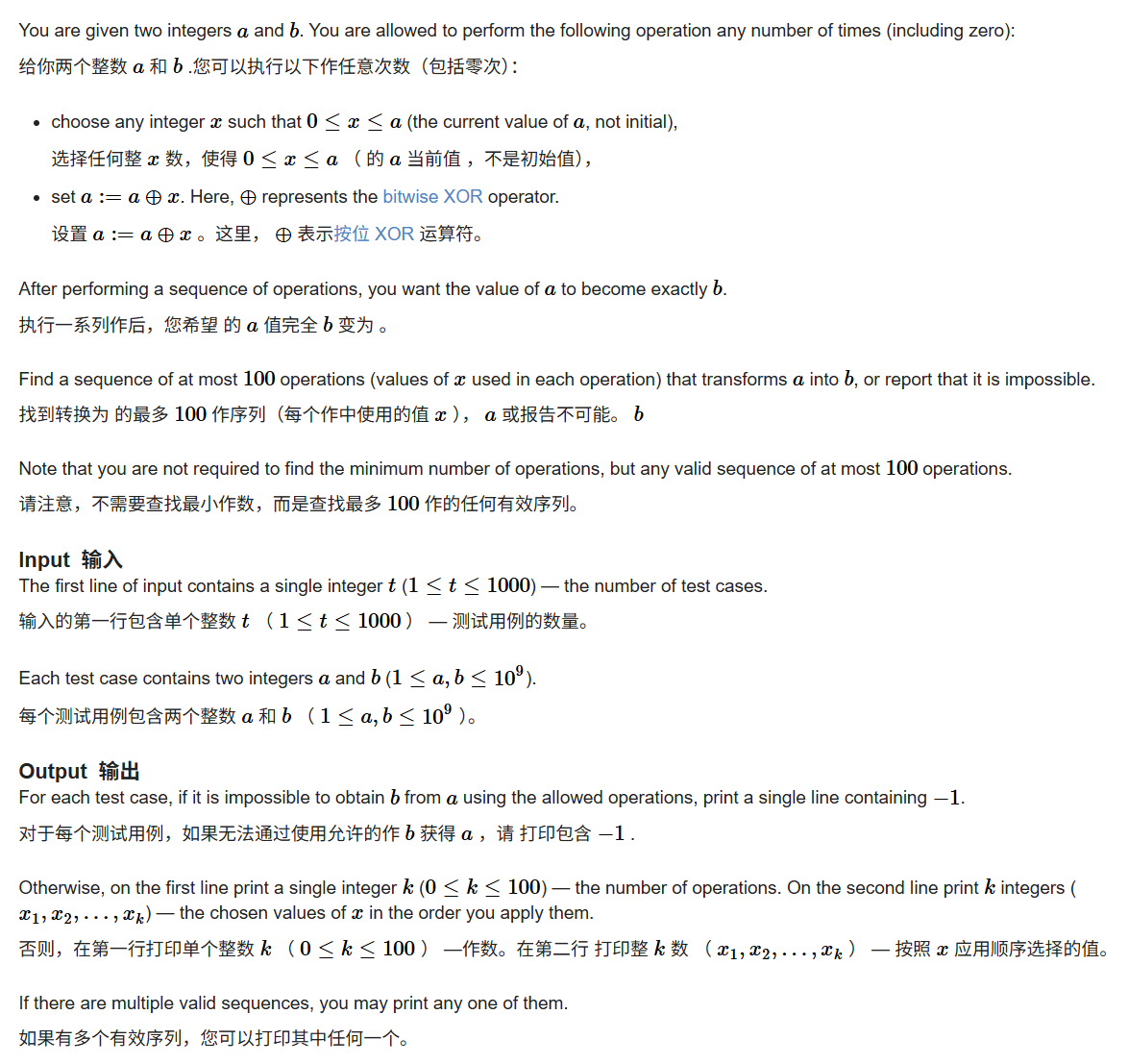 如果可以通过有限次操作将a变成b,就输出操作次数,和每次操作需要异或的数