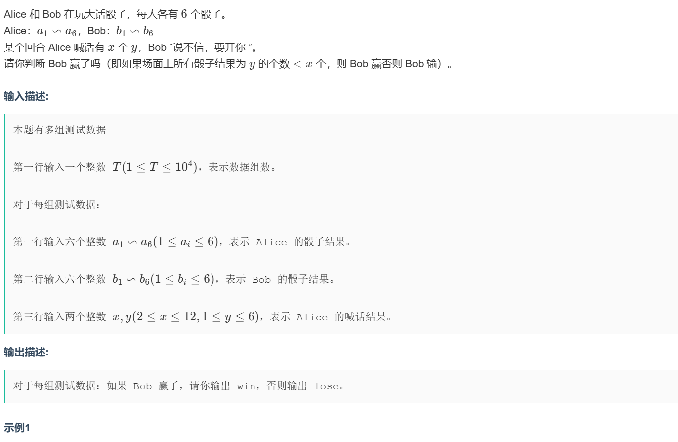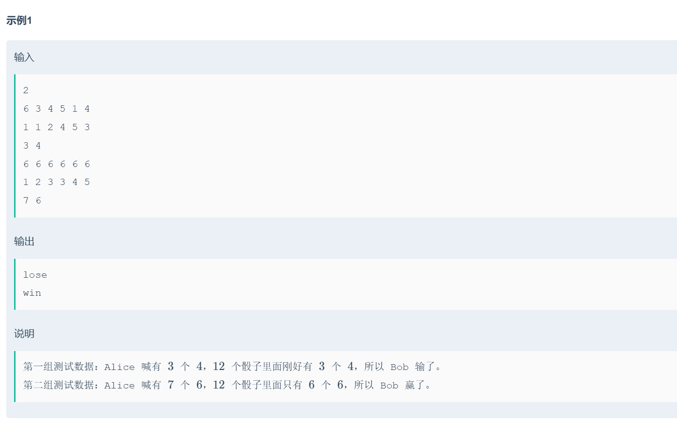 这题的题目意思很简单,就是有12个骰子,然后每个骰子有一个点数,然后输入俩个数x和y,如果12个骰子里,点数为y的骰子数量<x,就输出win,否则就输出lose