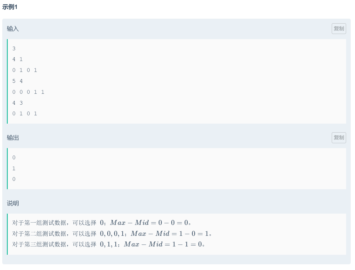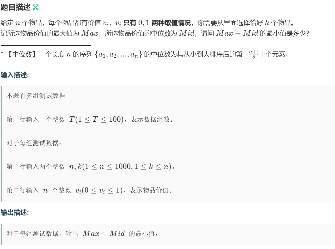 这题就是告诉你有n个物品,然后每个物品的价值不是0就是1,随后,要从这些物品里面选出k个物品,使得Max-Mid的值最小,问你最小值是多少