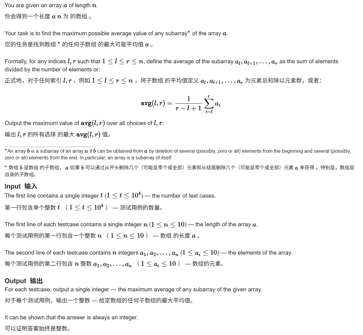 这题看着很长,其实就是给你一个数组,然后问你所有子数组中最大的平均值是多少,然后输出就好了