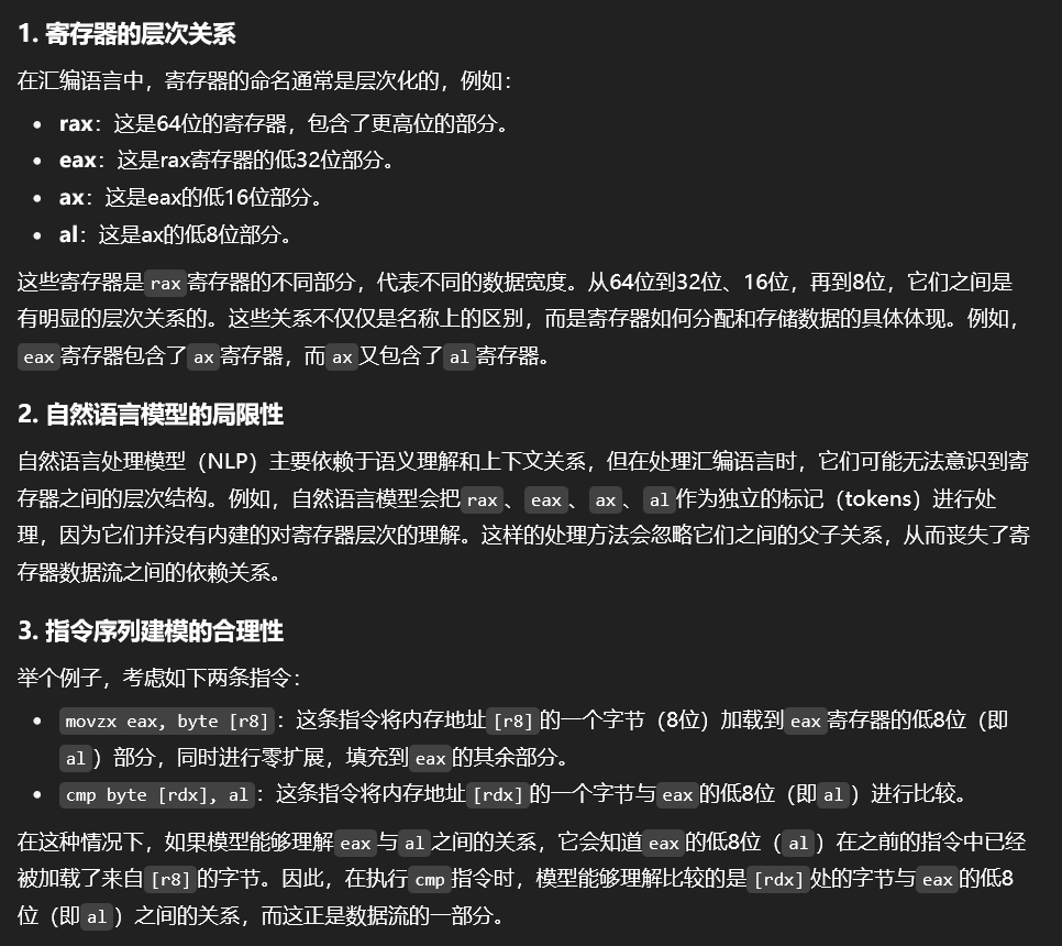 首先,现有方法缺乏对二进制代码中固有的先验知识的利用。大多数方法将二进制代码视为自然语言,并直接将自然语言模型应用于汇编语言。然而,汇编语言包含关于指令集架构(ISA)的知识,包括指令操作码的类型、操作数类型、操作码之间的关系以及其他信息。例如,对于 rax、eax、ax、al,自然语言模型会将它们视为独立的标记,但实际上,后面三个都是rax的一部分。因此,如果模型能够理解eax和al之间的关系,它就能在建模如 movzx eax, byte [r8]; cmp byte [rdx], al