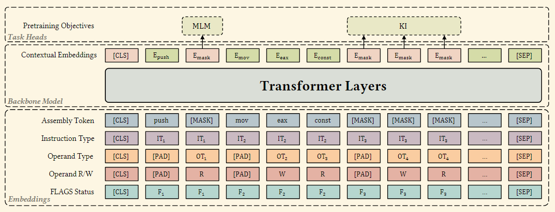 - 先验知识的融入:大多数基于Transformer的方法将二进制代码视为自然语言,并直接将语言模型应用于汇编语言。这可能忽略了二进制代码中固有的先验知识,如操作码类型、操作数类型等。