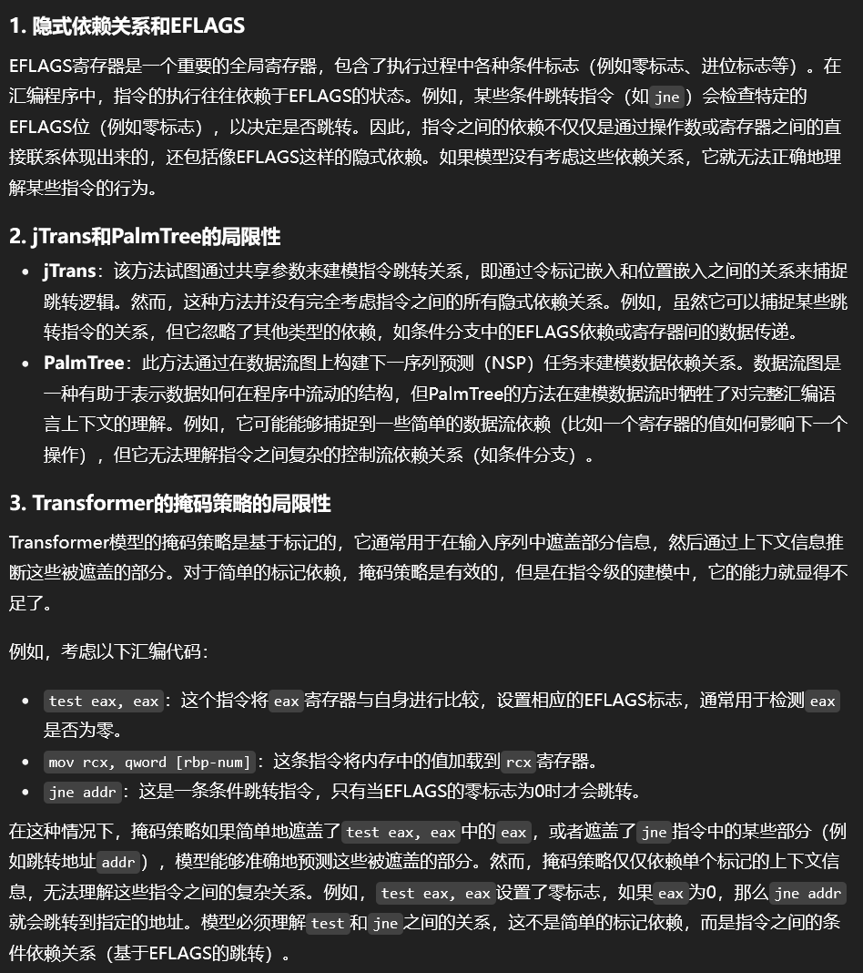 此外,现有方法缺乏对二进制代码中隐式依赖关系的建模。汇编指令并不是独立的实体,它们之间存在隐式依赖关系,例如全局标志寄存器EFLAGS。当前的方法通过手动设计部分地解决了隐式依赖关系。例如,jTrans通过在标记嵌入和位置嵌入之间共享参数来建模指令跳转关系,但它没有考虑其他依赖关系。PalmTree通过在数据流图上构建下一序列预测(NSP)任务来建模数据依赖关系,但它牺牲了对完整汇编语言上下文的建模能力。至于Transformer的掩码策略,本身一个简单的标记级掩码只能建模单个标记之间的依赖关系,无法捕捉指令之间的依赖关系。考虑如下汇编片段:test eax, eax; mov rcx, qword [rbp-num]; jne addr