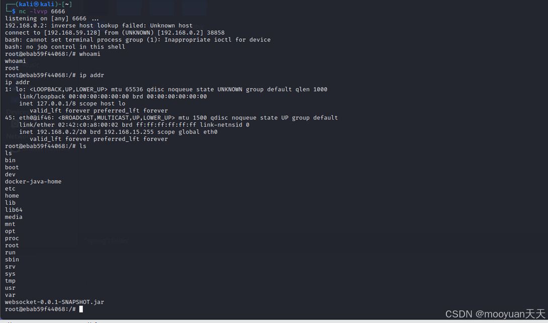 此时查看kali攻击机监听,已经连接成功,输入命令ip addr,返回正确结果,说明渗透成功。